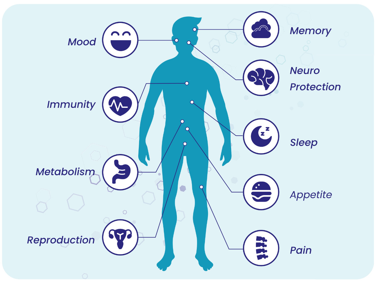 The ECS is a cellular communication network found throughout the body. It helps regulate key functions like mood, appetite, memory, inflammation, and recovery. Think of it like your body’s internal thermostat. When something pushes you out of balance—stress, fatigue, environmental toxins—the ECS helps restore equilibrium. But just like any system, it can fall behind when demand is high.